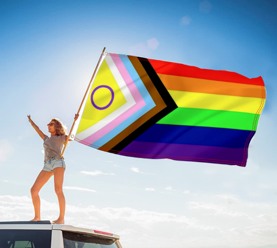 Bandera Progresista: Valentino Vecchietti creador de esta bandera, incluye un triangulo amarillo con un círculo morado, que representa a esta comunidad que no había sido incluida en los diversos cambios de los últimos años.