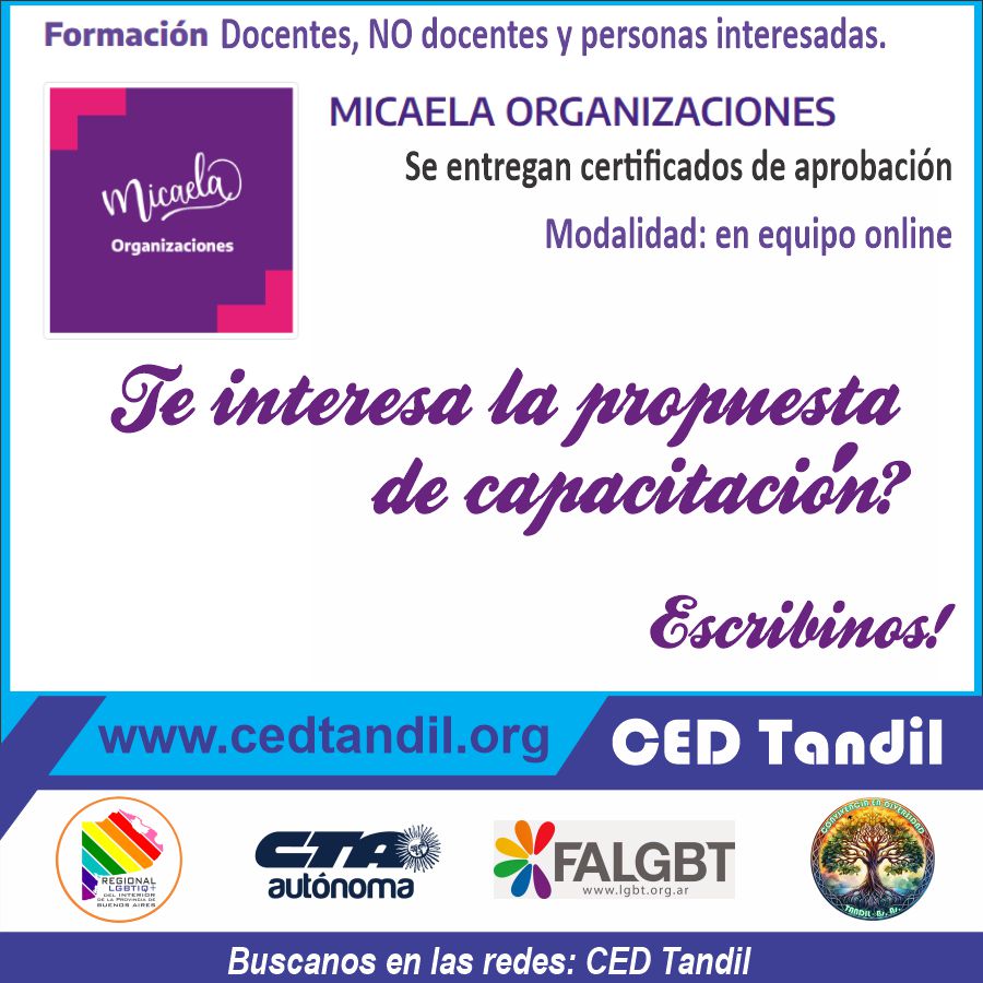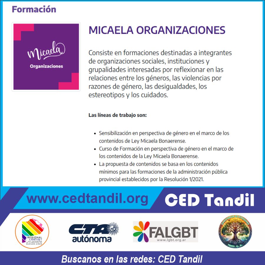 La línea pedagógica MICAELA ORGANIZACIONES consta de espacios de formación y sensibilización que buscan brindar nociones y herramientas que acompañen y fortalezcan los procesos de transversalización de la perspectiva de género y diversidad, y promuevan prácticas para la igualdad en las organizaciones mixtas de los distintos territorios bonaerenses, tanto hacia el interior de las mismas como en sus procesos comunitarios.